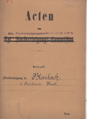Unter der Inventarnummer 291 finden sich sind 43 teilweise gebundene Dokumente zur Flurbereinigung in Blaubach. Den Dokumenten wurden durch Willi Becker jeweils Abschriften in heutiger Schreibschrift beigefügt.