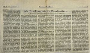 Beschreibung: Bei diesem Belegstück handelt es sich um einen von Rainer Dick verfassten Zeitungsartikel, welcher recht anschaulich die Gegebenheiten in und um Kusel etwa um das Jahr 1635 herum beschreibt. Der Artikel ist am 17.07.1985 in der Westricher Rundschau erschienen.