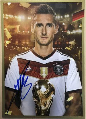 Beschreibung: Vom Blaubacher Fußballnationalspieler Miroslav Klose handsignierte Autogrammkarte mit dem Konterfei des Sportlers, mit dem Fifa-Weltpokal in Händen. Auf der Rückseite der Karte ist eine Seitenansicht des Fußballers abgedruckt