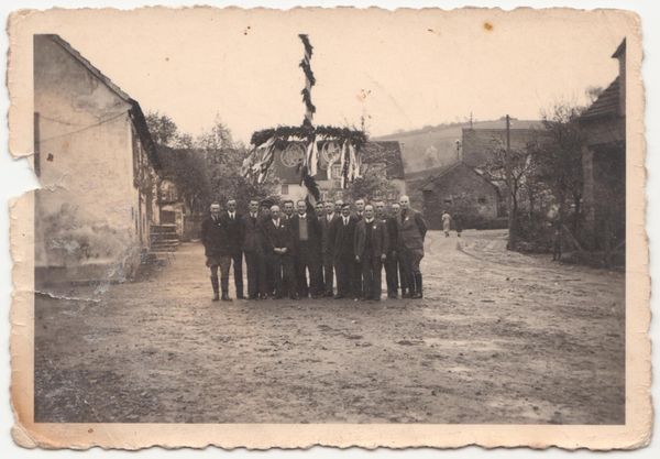 Auf dieser historischen Fotografie (älter als 1940) ist im Hintergrund unmittelbar rechts vom Maibaum bereits das 1929 neu errichtete Anwesen Clos zu sehen.