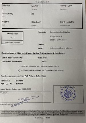 Beschreibung: Die Nachwelt wird es sich später wohl kaum noch vorstellen können mit welchen Unannehmlichkeiten die Menschen während der Coronapandemie belastet waren. Die hier abgelegte Testbescheinigung vom 25.03.2022 hat Martin Pfeiffer z. B. dafür gebraucht, dass er Abends an der Musikprobe des Musikvereins Konken teilnehmen konnte. Zeitweise fanden dort die Proben unter freiem Himmel auf dem Konker Sortplatz statt. Ohne Negativ-Bescheinigung keine Probe!