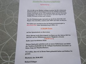 Beschreibung: Bei diesem Belegstück handelt es sich um die Kopie eines von Richard Edinger erstellten Aushanges in dem die Blaubacher Nachbarschaftshilfe darüber informiert, dass die Gruppe für die Opfer der Flutkatastrophe im nördlichen Rheinland-Pfalz 1.120 € gespendet hat. Klaus Jung hat hierzu ergänzt, dass davon 120 € bei einer Zusammenkunft der Ruheständler an der Blockhütte von weiteren Bürgern, unabhängig von der Nachbarschaftshilfe, gespendet worden sind.