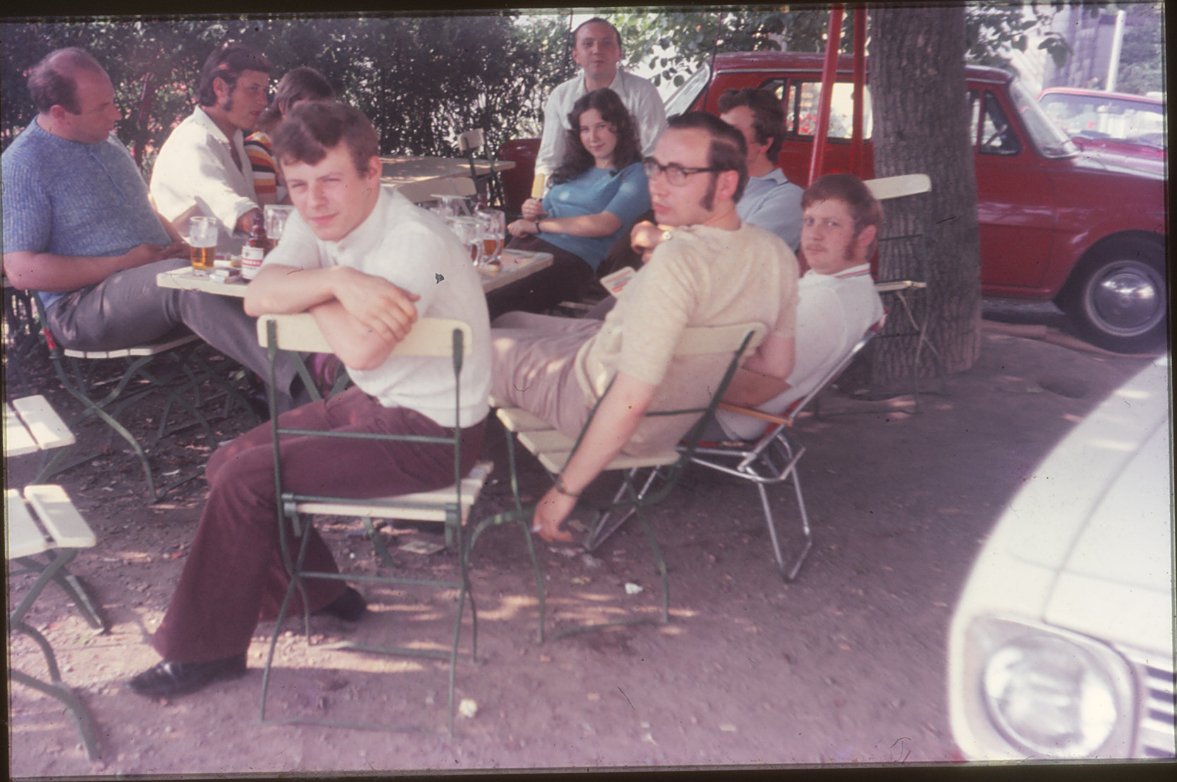 Gesellige Runde mit Bernhard Ruth, Alfred Becker, Klaus Edinger, Egon Barth, Ute Schneider, ?, Manfred Becker, Wolfgang Schneider, unter dem Nussbaum im Hof des Gasthauses Zum Dicken Daumen. Aufnahme aus ca. 1970.