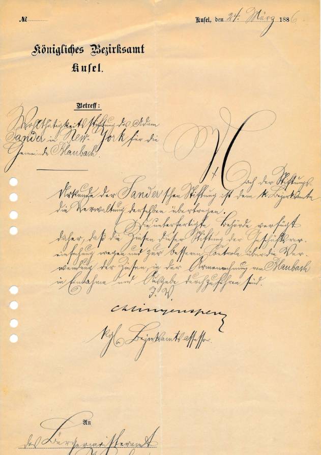 Übertragung des Stiftungsvermögens der Sander'schen Stiftung an die Bezirkskasse im Jahr 1886. Die Quelle befindet sich im Bestand des Auswanderermuseum Oberalben.