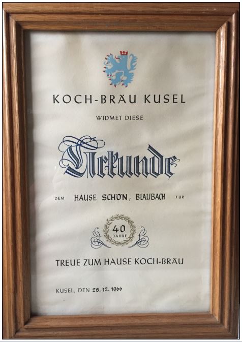 Urkunde der Brauerei Koch-Bräu aus Kusel anlässlich 40-jähriger Geschäftsbeziehung