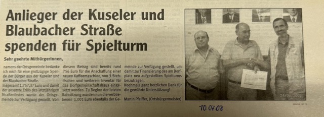 Artikel aus dem Wochenblatt. Richard Edinger und Wolfgang Schneider überreichen den Spendenscheck an den damaligen Ortsbürgermeister Martin Pfeiffer.