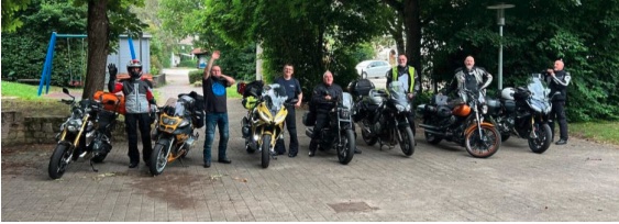 Motorradfreunde bei der Abfahrt zur Sommertour 2024 am Blaubacher Dorfplatz