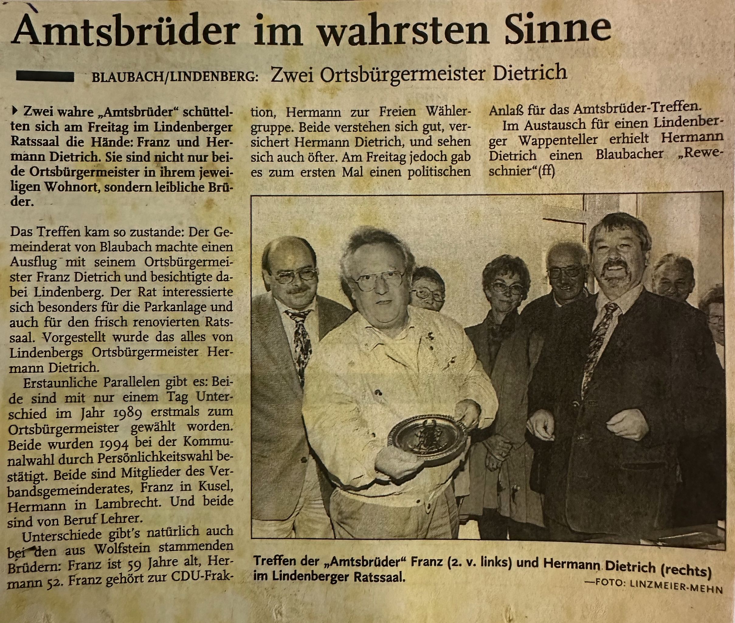 Artikel über das Zusammentreffen der beiden Amtsbrüder Franz und Hermann Dietrich in Lindenberg.