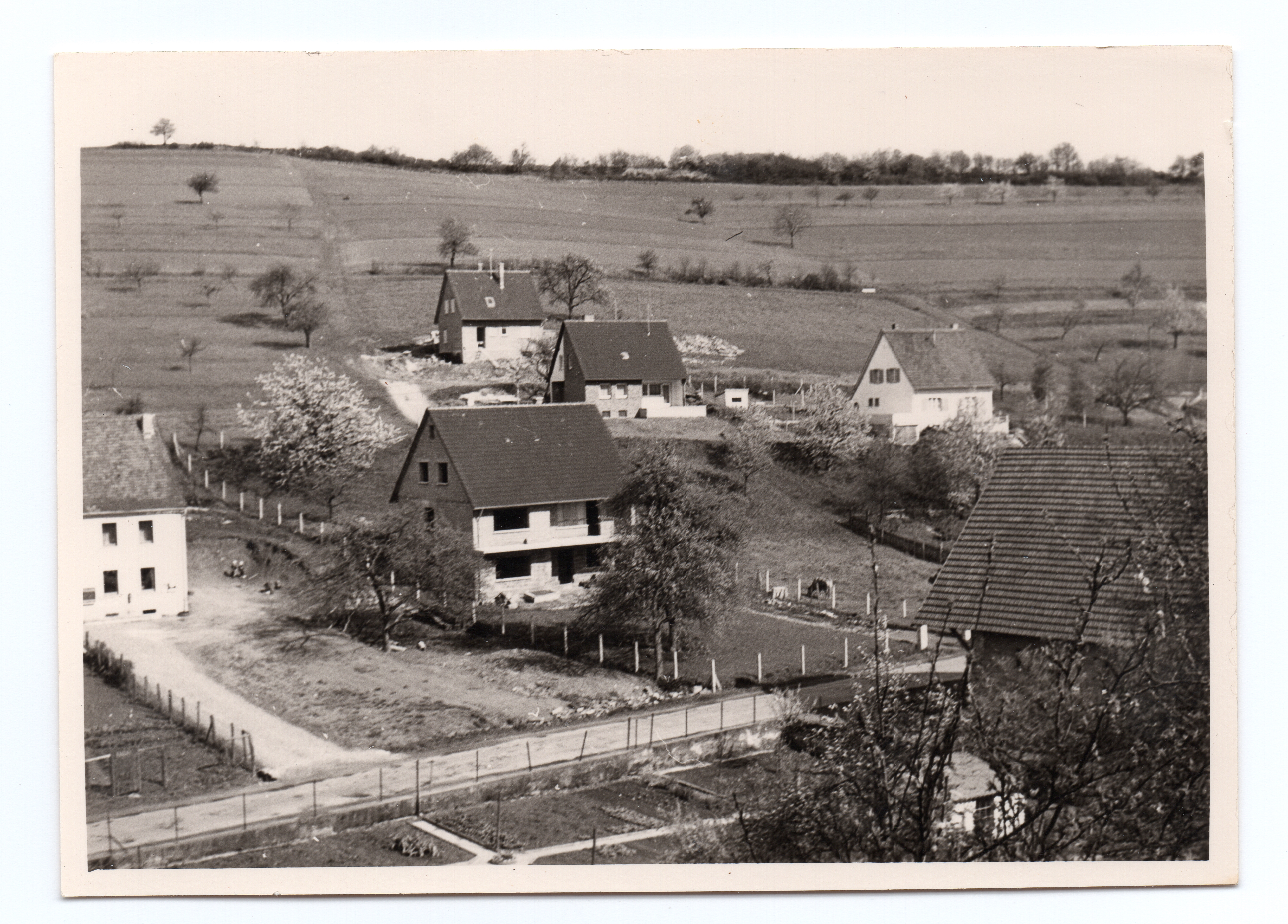 Ältere Aufnahme aus den 1960-iger Jahren mit Häusern aus der Kuseler Straße und den ersten Häusern des gerade entstehenden Baugebietes Am Äckerchen.