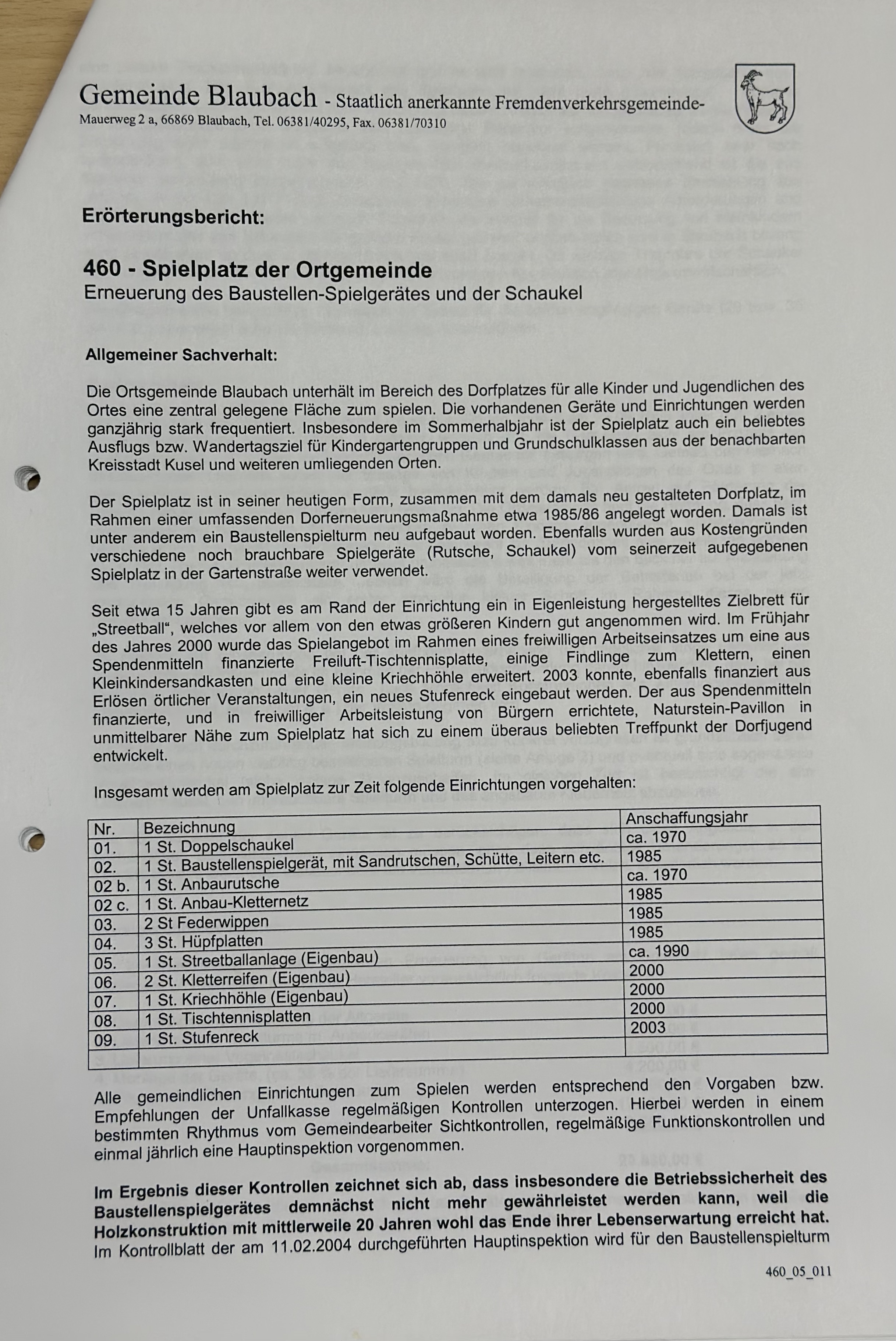 Vom Ortsbürgermeister erstellter Erörterungsbericht Erneuerung Spielplatz