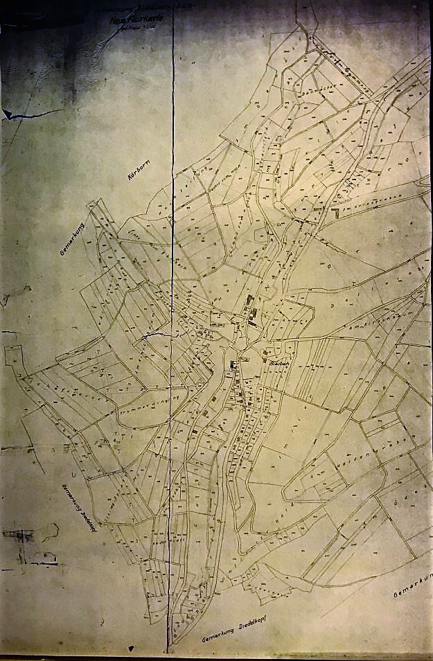 Neue Flurkarte aus den 1960-iger Jahren mit der damals neuen Einteilung der Gewannen und Grundstücke.