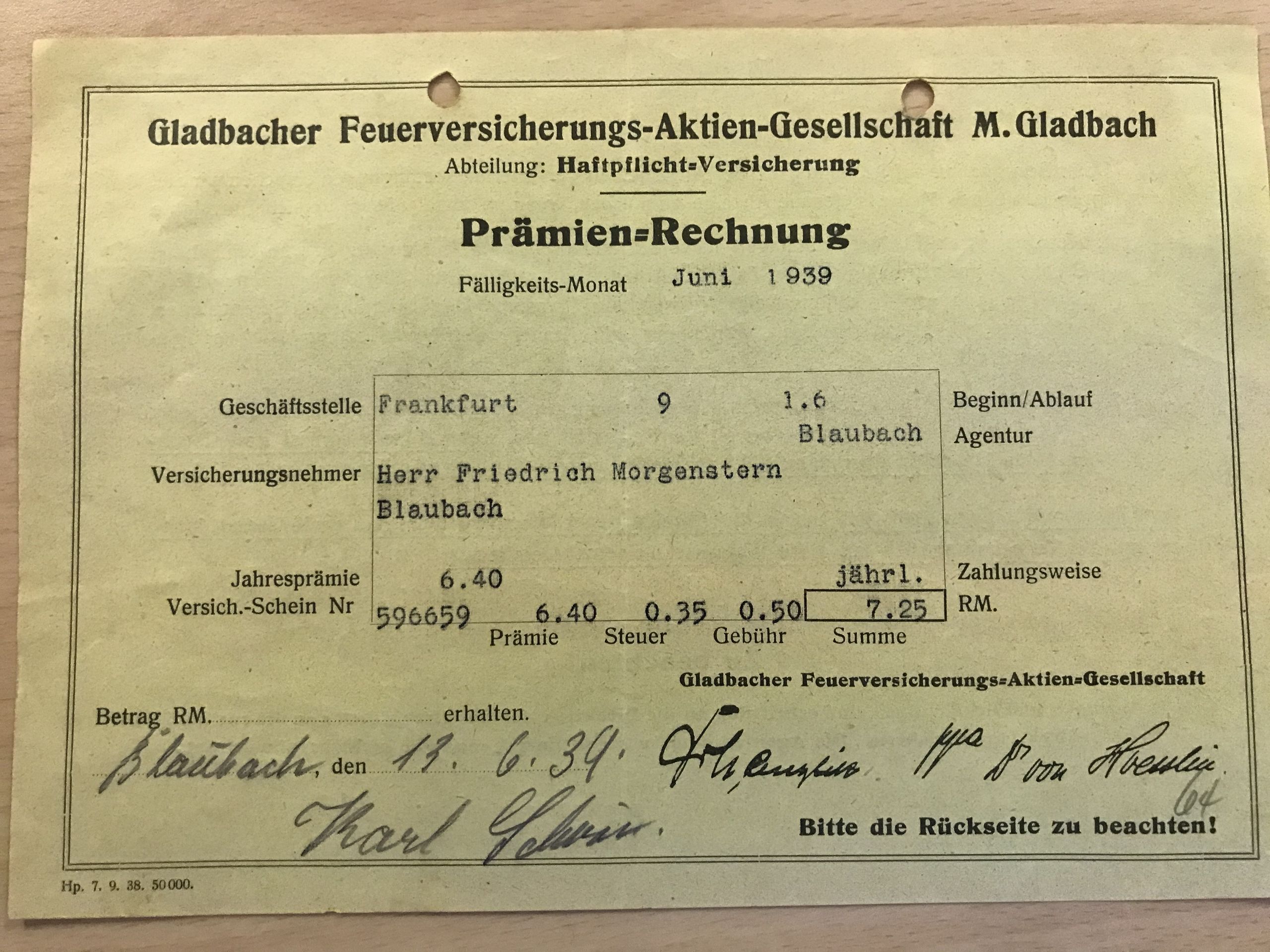 Prämienrechnung der Gladbacher_Feuerversicherung