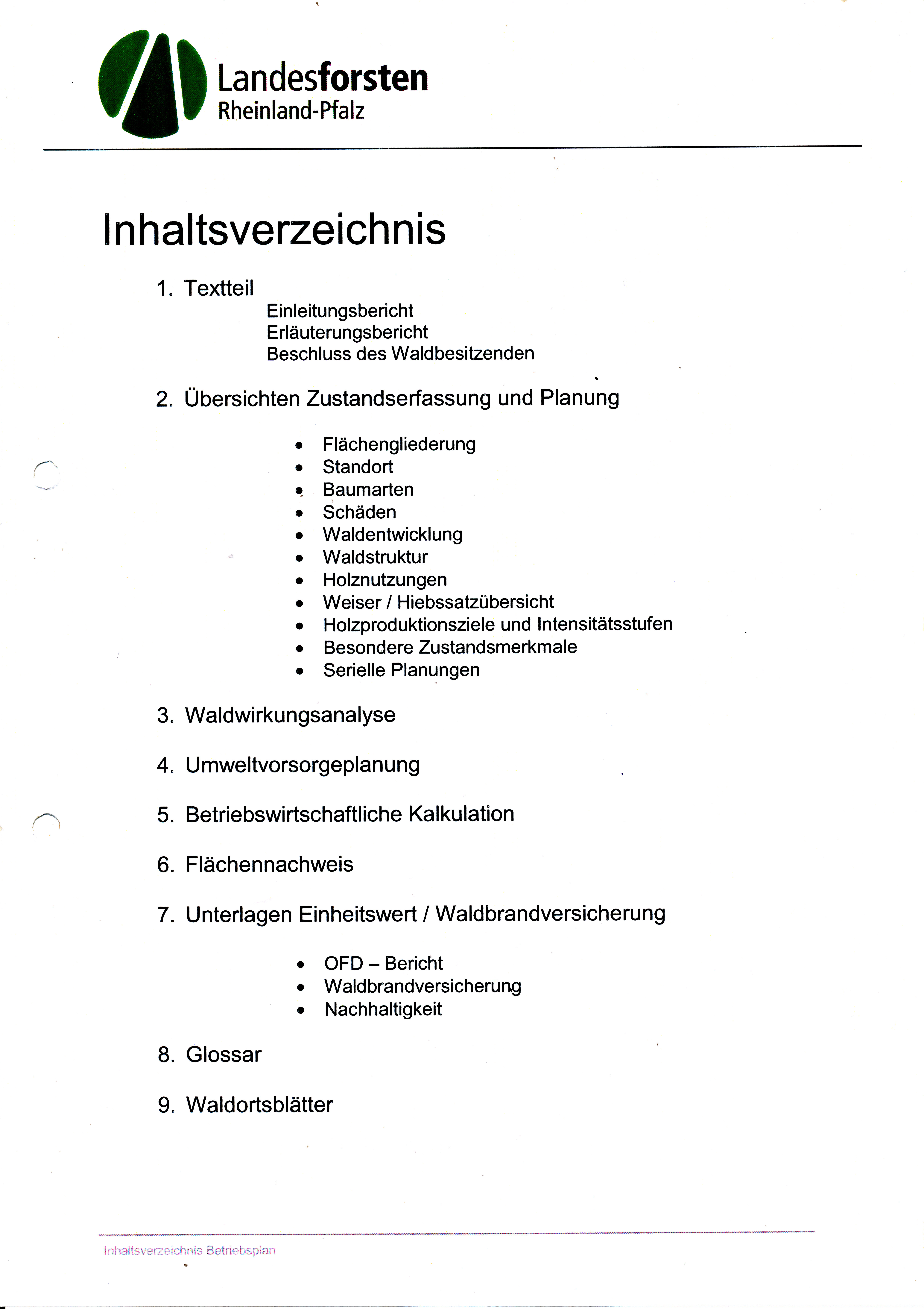 Inhaltsverzeichnist des Forstbetriebsplanes 2005