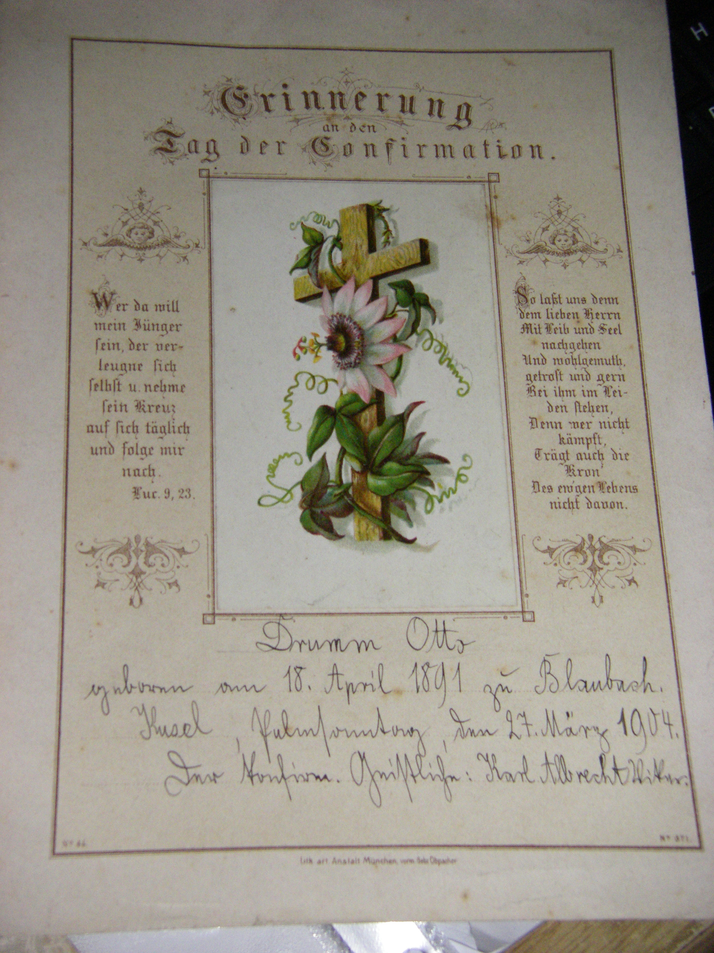 Konfirmationsurkunde von Otto Friedrich Drumm (1891-1965).