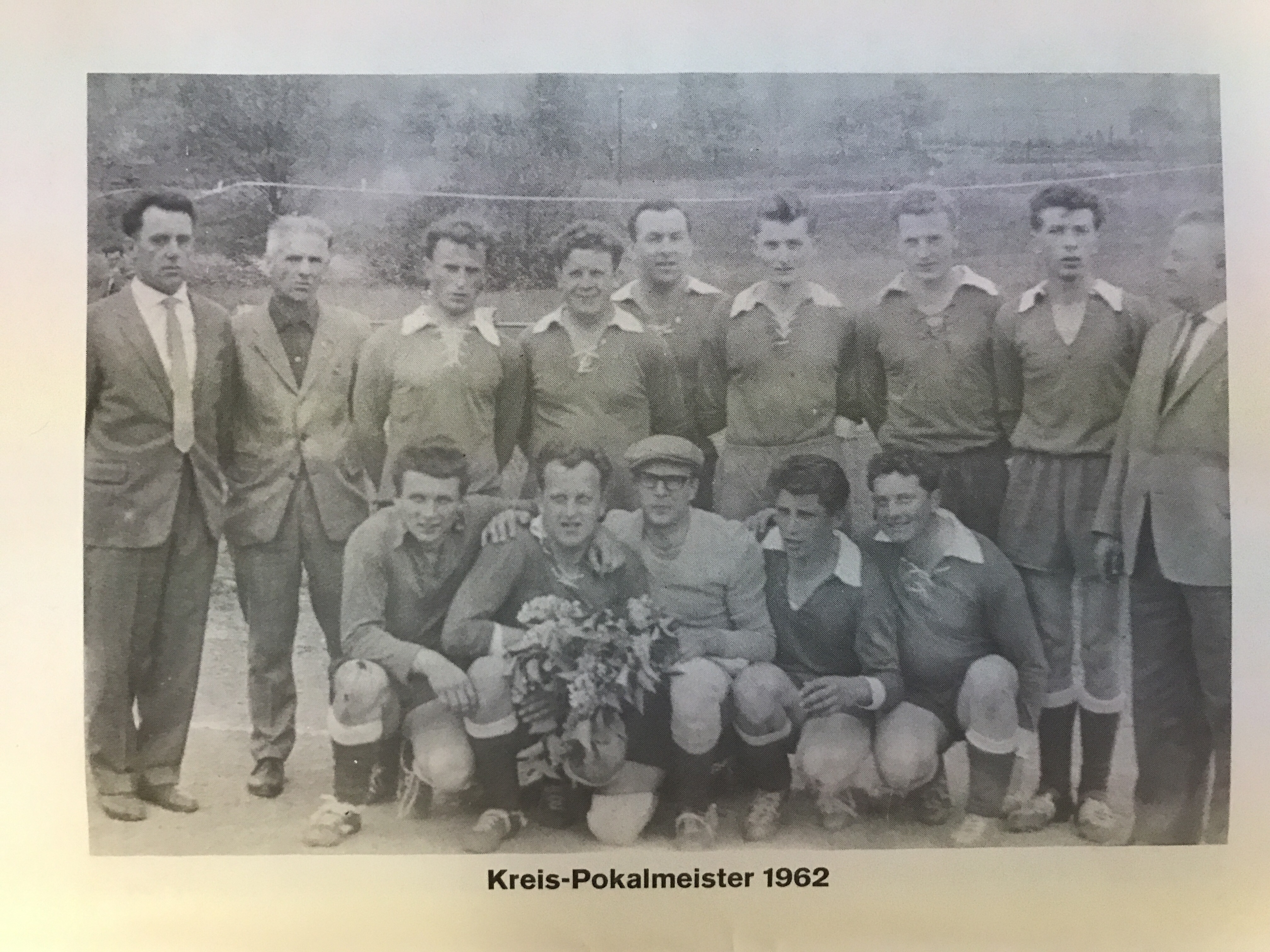 Foto der Mannschaft Kreispokalmeister_1962 Hintere Reihe v . l. n. r.: Herbert Bach, Fritz Weber sen., Karl-Heinz Clos, Max Emrich, Edgar Weingarth, [[Rolf Rech}}, Gerhard Hennchen, Walter Drumm, Willi Rech, vordere Reihe v. l. n. r.: Fritz Weber jun, Horst Scholz, Herbert Stein, Hans Weber, August Weingarth.