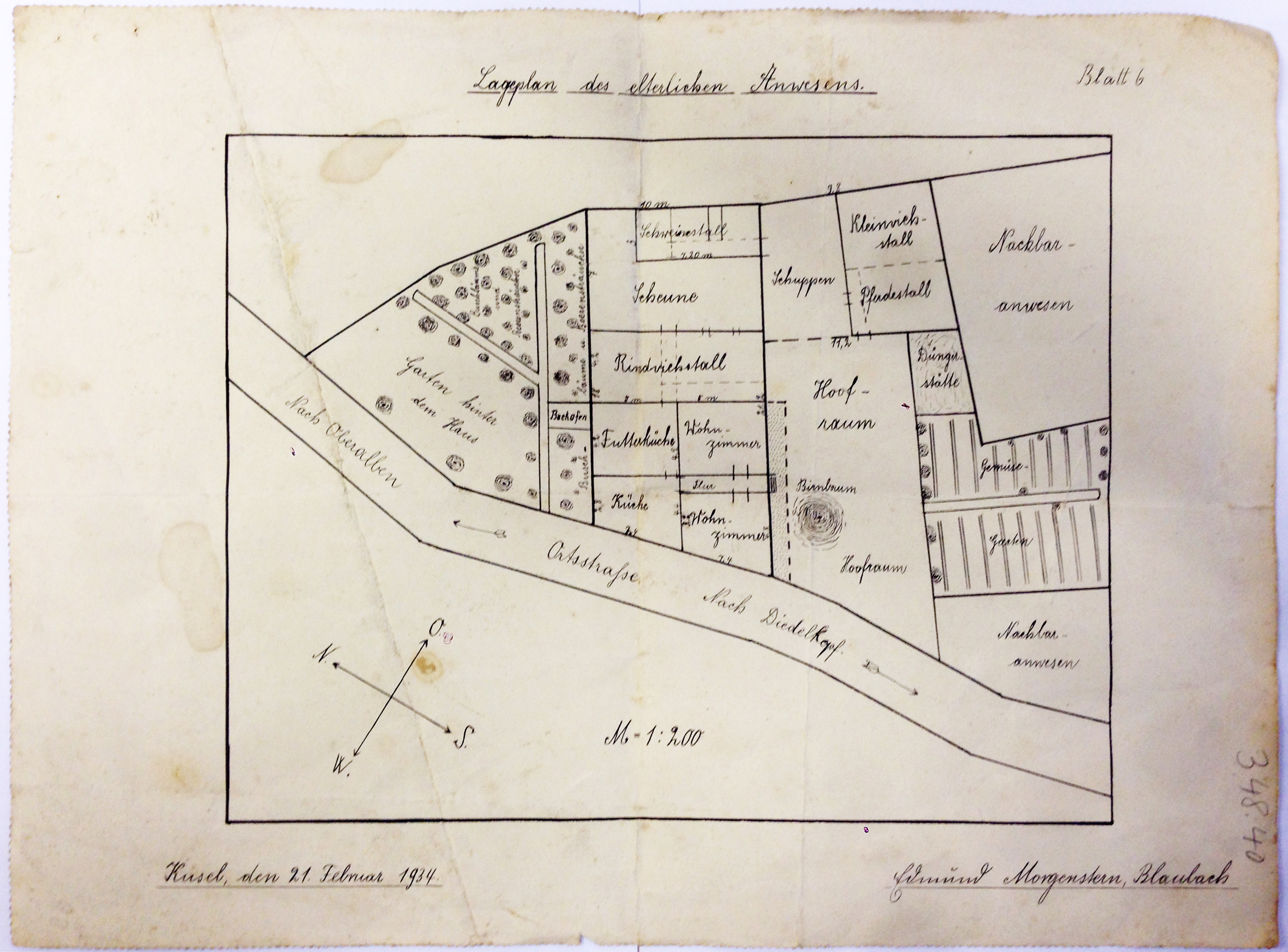 Karte des Anwesens im heutigen Mauerweg 2 aus dem Jahr 1934. Gefunden auf dem Dachspeicher des Hauses Mauerweg 2, überlassen von Martin Pfeiffer.