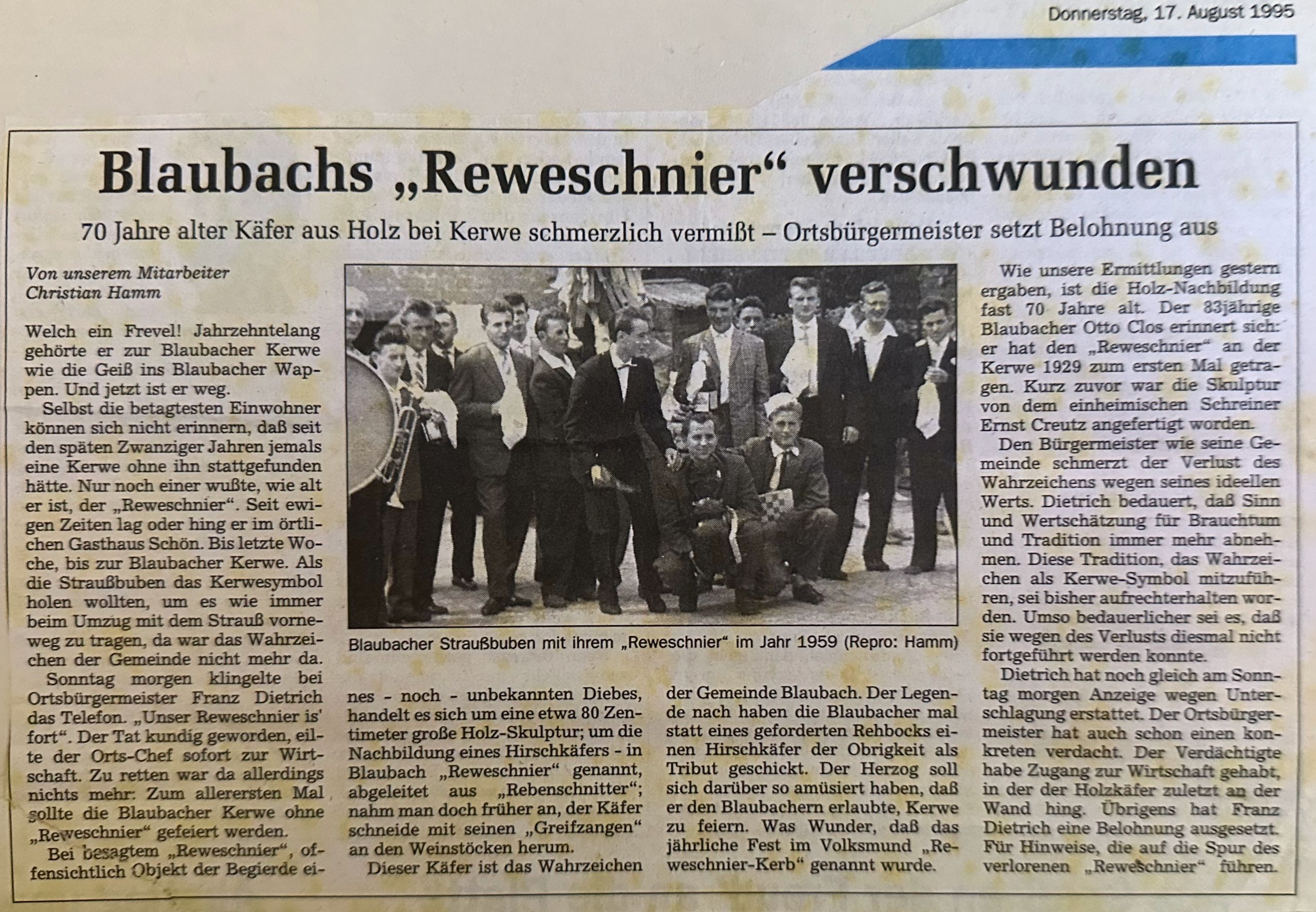 Der Zeitungsartikel berichtet über den verschwundenen hölzernen Reweschnier-Käfer.