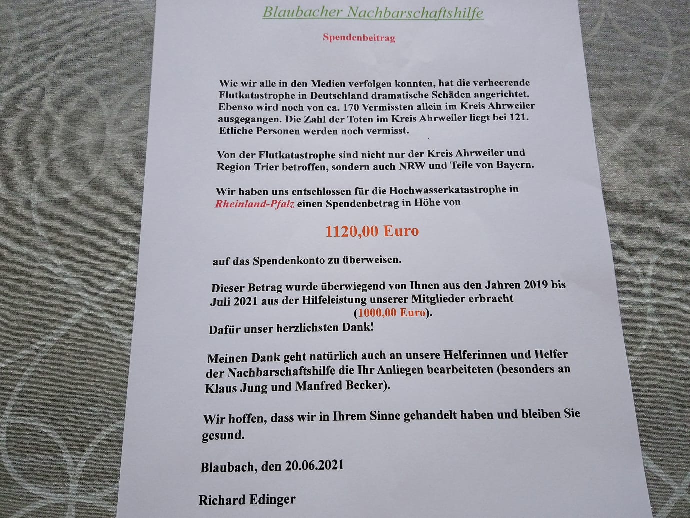 Aushang über eine Spende der Nachbarschaftshilfe Blaubach an die Opfer der Flutkatastrophe in Rheinland-Pfalz