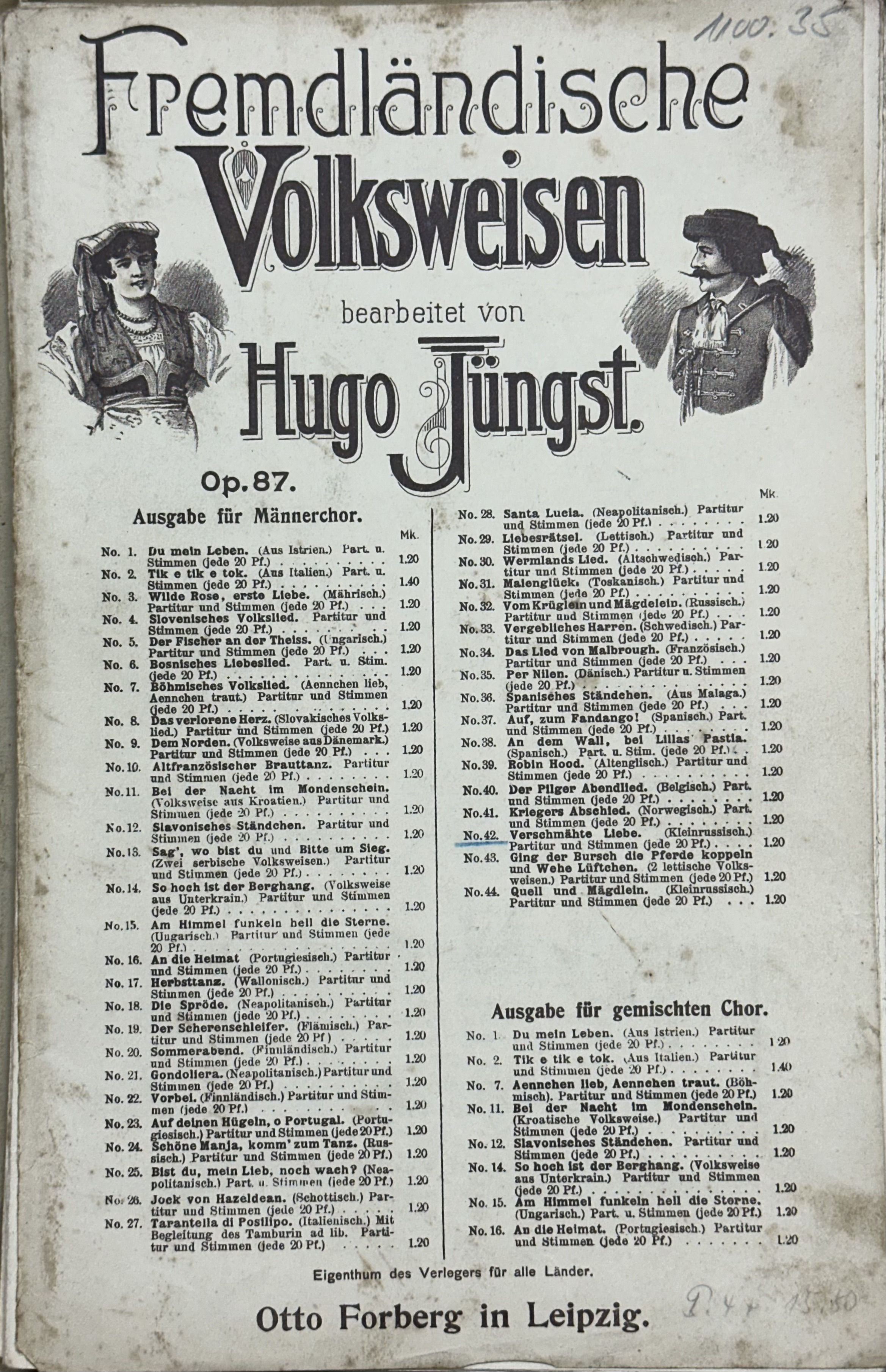 Titelblatt: Fremdländische Volksweisen,. bearbeitet von Ernst Jüngst, Verlag Otto Forberg in Leipzig.