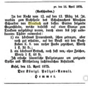 Zum Nachtheile des Schuhmachers Abraham Schneider von Blaubach, wurden in der Nacht vom 12. auf den 13. März 1875 aus dessen Garten folgende Gegenstände, welche daselbst auf einer Stange zum Trocknen aufgehängt waren, durch einen bis jetzt unbekannten Thäter entwendet: