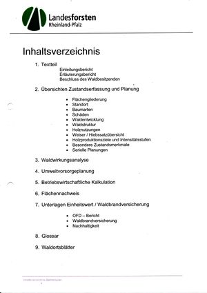 Bei diesem Belegstück handelt es sich um den mehr als 100 Seiten umfassenden "Betriebsplan Forstamt Kusel - Gemeinde Blaubach - Funktionseinheit Lichtenberg". Neben einem eher allgemeinen Einleitungsbericht enthält der Betriebsplan eine detaillierte Beschreibung der 2005 bestehenden forstlichen Situation in Blaubach. Zahlreiche Tabellen und anschauliche Grafiken dokumentieren sowohl den damaligen Bestand als auch die künftig für den Gemeindewald geplante Entwicklung.
