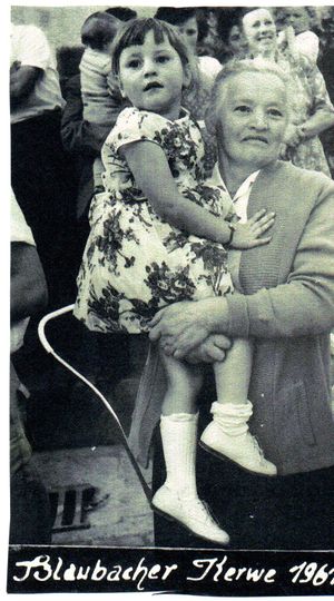 Beschreibung: Das als Papierausdruck im Archiv vorhandene Foto ist ausweislich Bildunterschrift an der Kerwe des Jahres 1961 entstanden. Die Aufnahme zeigt die 1983 verstorbene Mathilde Schultheiß, geb. Albert. Das Kind auf dem Arm ist (ihre Enkelin) die Blaubacher Mitbürgerin Ulrike Becker, geb. Ruth.