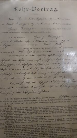 Das von Gabi Jungblut zur Verfügung gestellte Foto zeigt hinten links Georg Eisinger. Die Aufnahme dürfte vermutlich 1925 (oder 1930?) beim 25-jährigen (30-jährigen?) Vereinsjubiläum des FCK entstanden sein. Das 2. Foto ist eine Abbildung des Lehrvertrages aus 1893. Georg Eisinger hat demnach am 22. Mai 1893 mit noch nicht einmal 14 Jahren seine Lehre begonnen, um innerhalb 4 Lehrjahren den Beruf des Schriftsetzers zu erlernen.