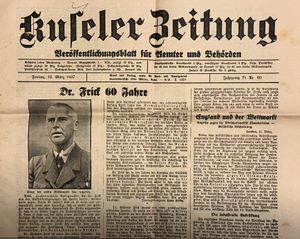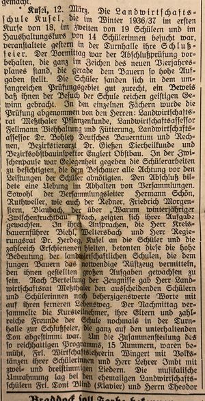 Beschreibung: Beschreibung: Bei diesem "Speicherfund" handelt es sich um eine Ausgabe der "Kuseler Zeitung" vom 12. März 1937. Man kann davon ausgehen, dass die Zeitung vor allem deswegen aufgehoben worden ist, weil auf der letzten Seite der Zeitung über eine Abschlussfeier der Kuseler Landwirtschaftsschule berichtet wird. Im Artikel erfährt man, dass Friedrich Morgenstern aus Blaubach über das Thema "Warum winterjähriger Zwischenfruchtanbau" eine Rede gehalten hat.