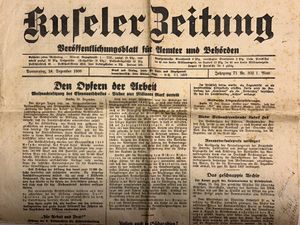 Beschreibung: Bei diesem "Speicherfund" handelt es sich um eine 2 x vorhandene Ausgabe der "Kuseler Zeitung" vom 24.12.1936. Man kann davon ausgehen, dass die beiden Exemplare vor allem deswegen aufgehoben worden sind, weil auf der letzten Seite der Zeitung die Verlobungsanzeigen von zwei Blaubacher Brautpaaren abgedruckt sind: