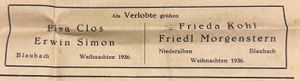 "Als Verlobte grüßen zu Weihnachten 1936 Elsa Clos & Erwin Simon, sowie das Brautpaar Frieda Kohl & Friedl Morgenstern."