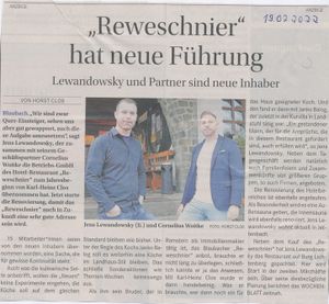 Beschreibung: Die von Horst Cloß im Stil eines redaktionellen Artikels verfasste Anzeige, beschreibt den zwischenzeitlich vollzogenen Führungswechsel im örtlichen Hotel-Restaurant Reweschnier. Im Text erfährt man, dass Jens Lewandowsky zusammen mit seinem Geschäftspartner Cornelius Woitke die Betriebs-GmbH des Hotel-Restaurants von Karl-Heinz Clos übernommen hat. Jetzt starte die Renovierung, damit das Haus Reweschnier auch in Zukunft eine sehr gute Adresse sein wird.