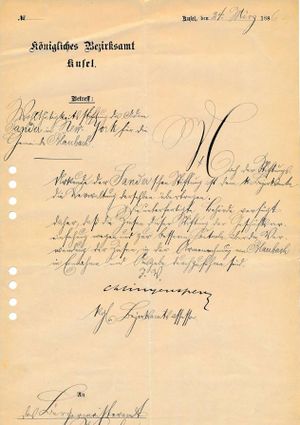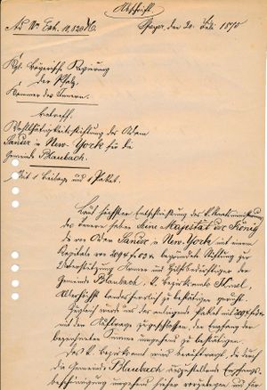 Abschrift eines Briefs der königlich-bayerischen Regierung der Pfalz, Kammer des Inneren vom 30. Juli 1875. Betreffend: "Wohltätigkeitsstiftung des Adam Sander in New-Yorck für die Gemeinde Blaubach." Seite 1 von 2