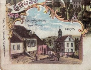 Keiner der heute lebenden Blaubacher kann sich mehr daran erinnern, dass es in der Straße Am Matzenberg im heutigen Haus Nr. 20 einmal die Spezereihandlung von Peter Klos gegeben. hat. Der hier gezeigte kleine Ausschnitt ist Bestandteil der alten Postkarte Lithographie Ortslage Blaubach um 1906.