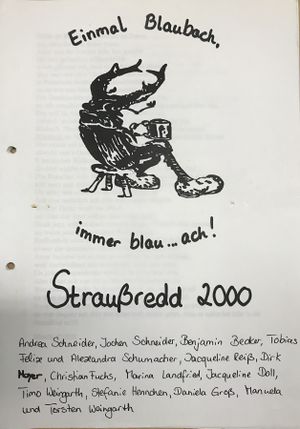 Beschreibung: Text der Straußrede des Jahres 2000. Die Ansprache stand damals unter dem Motto: "Einmal Blaubach, immer blau ... ach! Auf dem Titelblatt sind die Mitglieder der Straußjugend festgehalten.