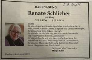 Beschreibung: Aus der in der Westricher Rundschau erschienenen Todesanzeige und der Danksagung kann man entnehmen, dass Regine Renate Schlicher, geb. Haug am 29.02.1936 geboren und am 22.06.2024 verstorben ist.