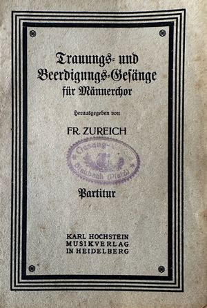 Beschreibung: Bei diesem leider undatierten antiquarischen Belegstück handelt es sich um als Partitur und in den verschiedenen Stimmlagen vorhandene Hefte "Trauungs- und Beerdigungsgesänge für Männerchor", welche vor vielen Jahrzehnten vom Musikverlag Karl Hochstein, Heidelberg herausgegeben wurden. Die im Archiv vorhandenen 20 Stück Hefte stammen aus dem Fundus des Gesangsverein Blaubach.