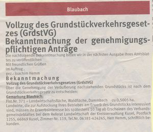 Beschreibung: Beim Belegstück Nr. 876 handelt es sich um eine im Wochenblatt vom 04.02.2022 abgedruckte amtliche Bekanntmachung. Inhaltlich geht es um den Vollzug des Grundstücksverkehrsgesetzes (GrdstVG). Der bisherige Eigentümer des 5.005 m2 großen Flurstücks-Nr. 371 möchte sein Grundstück verkaufen. Weil es sich um ein Grundstück im Außenbereich handelt, und weil die Fläche mehr als 0,5 ha groß ist, muss die geplante Veräußerung öffentlich bekannt gemacht werden. Landwirte können unter bestimmten Bedingungen ihr Erwerbsinteresse beim Referat Landwirtschaft der Kreisverwaltung bekunden.