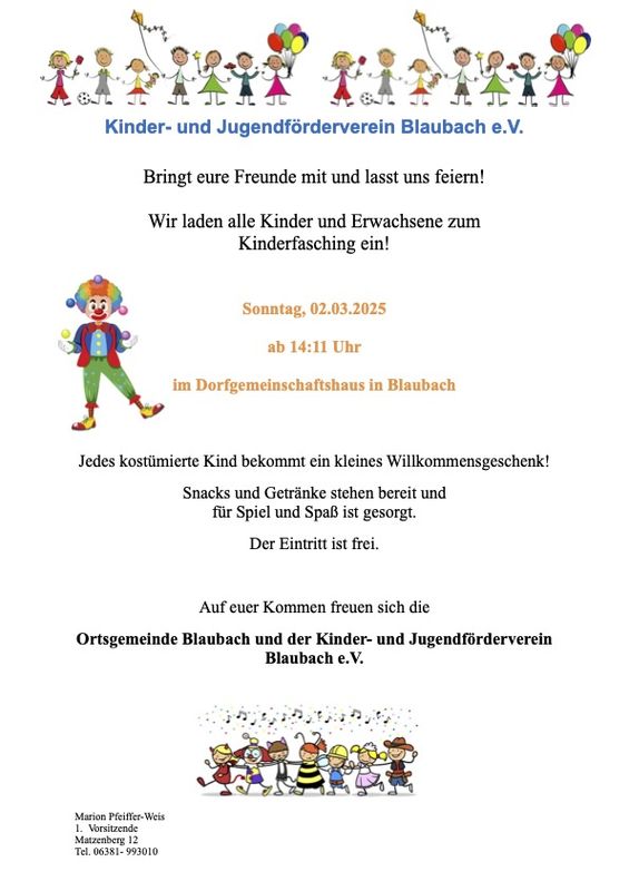 Ein herzliches Dankeschön gilt dem Kinder- und Jugendförderverein Blaubach e.V. sowie der Ortsgemeinde Blaubach, die das Osterfeuer hervorragend organisiert haben. Dank ihres Engagements und der guten Zusammenarbeit wurde die Veranstaltung zu einem rundum gelungenen Fest für Jung und Alt.