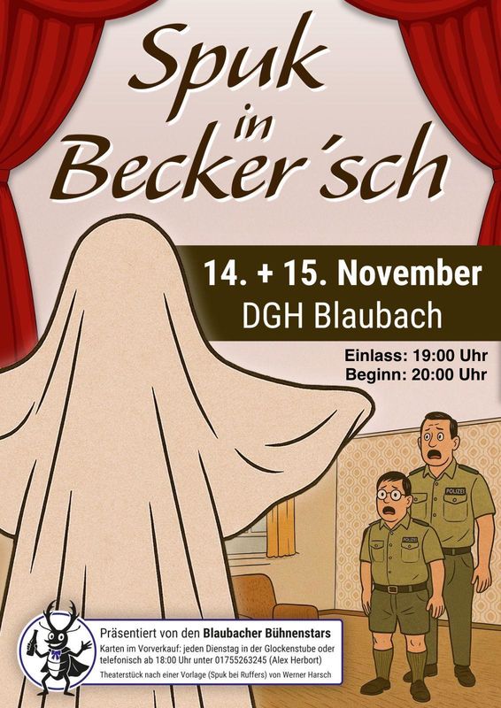 Am 15. November 2025 luden die „Blaubacher Bühnenstars“ zu ihrer Aufführung des Theaterstücks „Spuk in Becker ’sch“ ins Dorfgemeinschaftshaus ein. Die Laienspielgruppe, die sich im September 2024 neu formiert hatte, feierte damit ein weiteres gelungenes Comeback nach ihrer letzten Aufführung im Jahr 2019 und der anschließenden Corona-Pause.