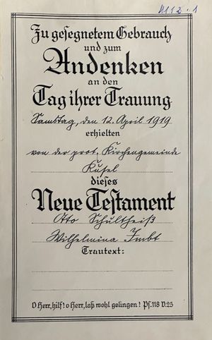 Beschreibung: Bei diesem Belegstück handelt es sich um die erste Seite des Neuen Testamentes welches den Brautleuten Otto Schultheiß und Wilhelmina Imbt anlässlich ihrer Trauung am 12. April 1919 von der Protestantischen Kirchengemeinde Kusel überreicht wurde. Beim zugehörigen Belegstück 1112.2 handelt es sich um den Trauspruch der Eheleute.